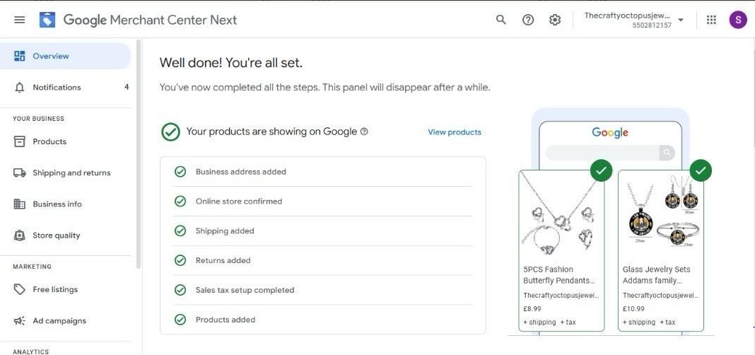 Maximize your store's performance with expert setup and management of Google Merchant Center and Google Analytics. I help eCommerce brands connect their products seamlessly with Google Shopping, ensuring every listing is properly optimized, approved, and visible to high-intent shoppers.